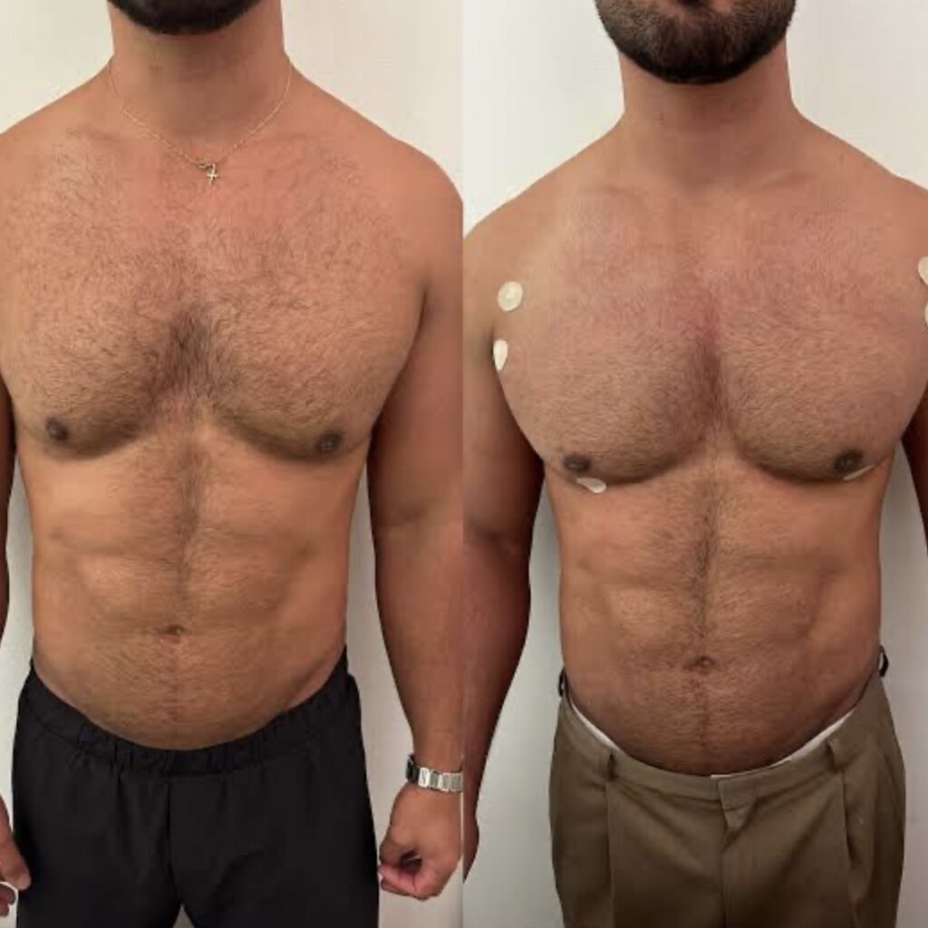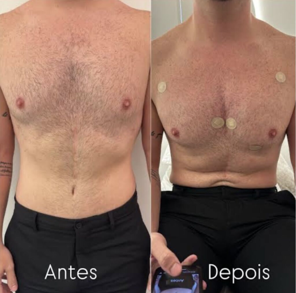 Como funciona O ácido hialurônico corporal é injetado em pontos estratégicos do peitoral, definidos de acordo com os objetivos do paciente e o formato ideal para o seu corpo. O procedimento é realizado com anestesia local, sem cortes e sem necessidade de internação, e tem duração média de 1 hora. Durante a aplicação, o produto atua de forma tripla: Aumenta o volume e projeta o peitoral, criando um aspecto mais atlético; Modela e define os contornos para uma aparência natural e simétrica; Hidrata profundamente a pele e estimula a produção de colágeno, garantindo mais firmeza. O resultado é um peitoral marcado, proporcional e harmônico, sem exageros e sem parecer artificial.